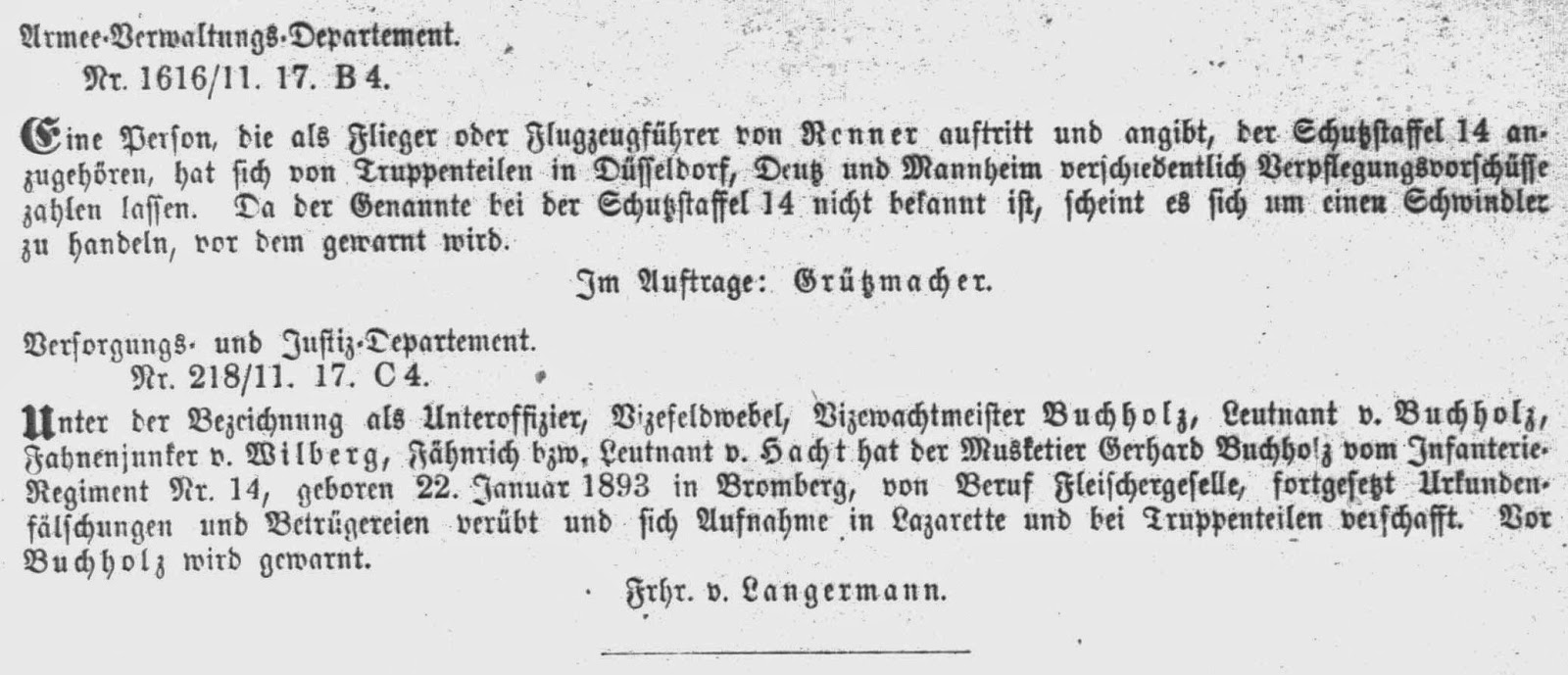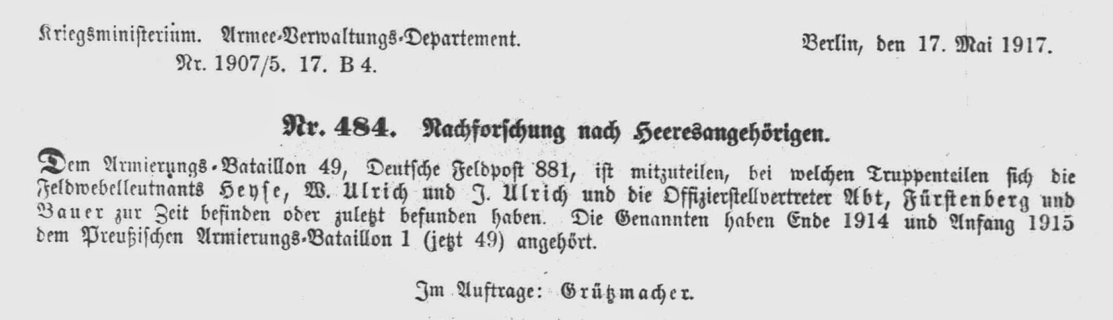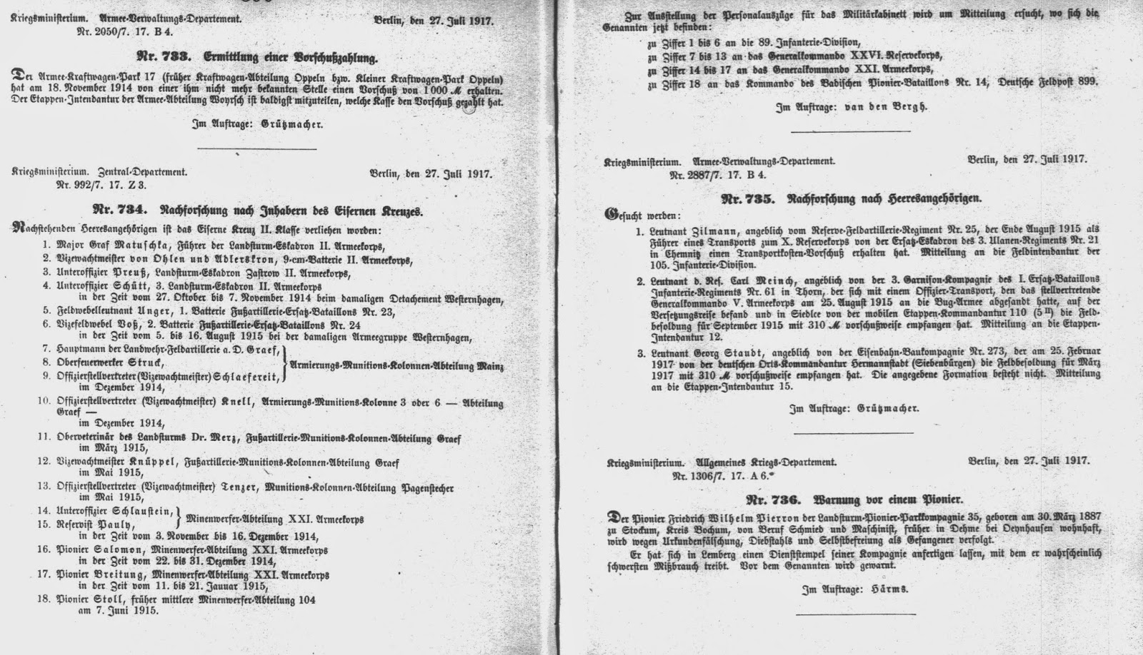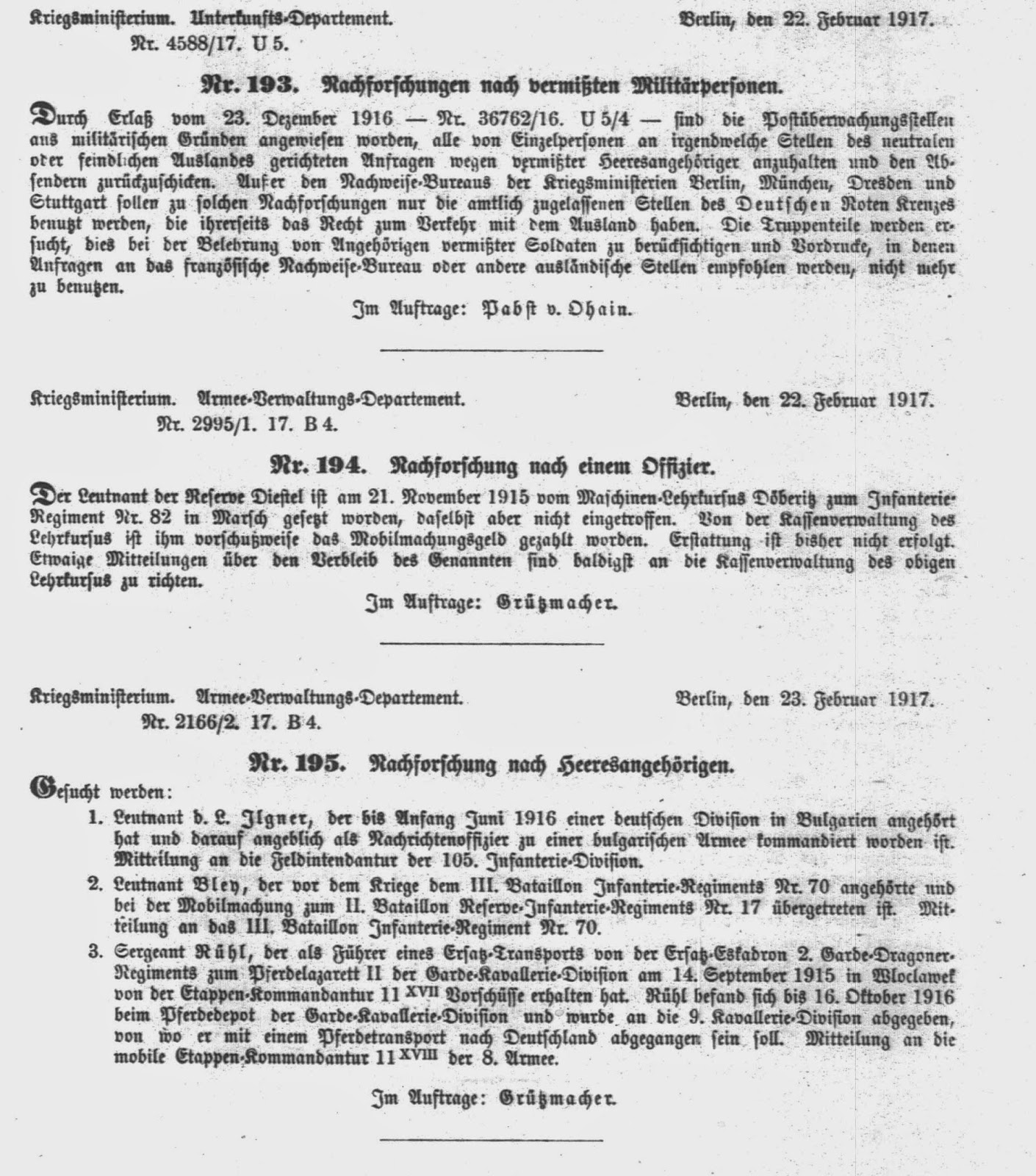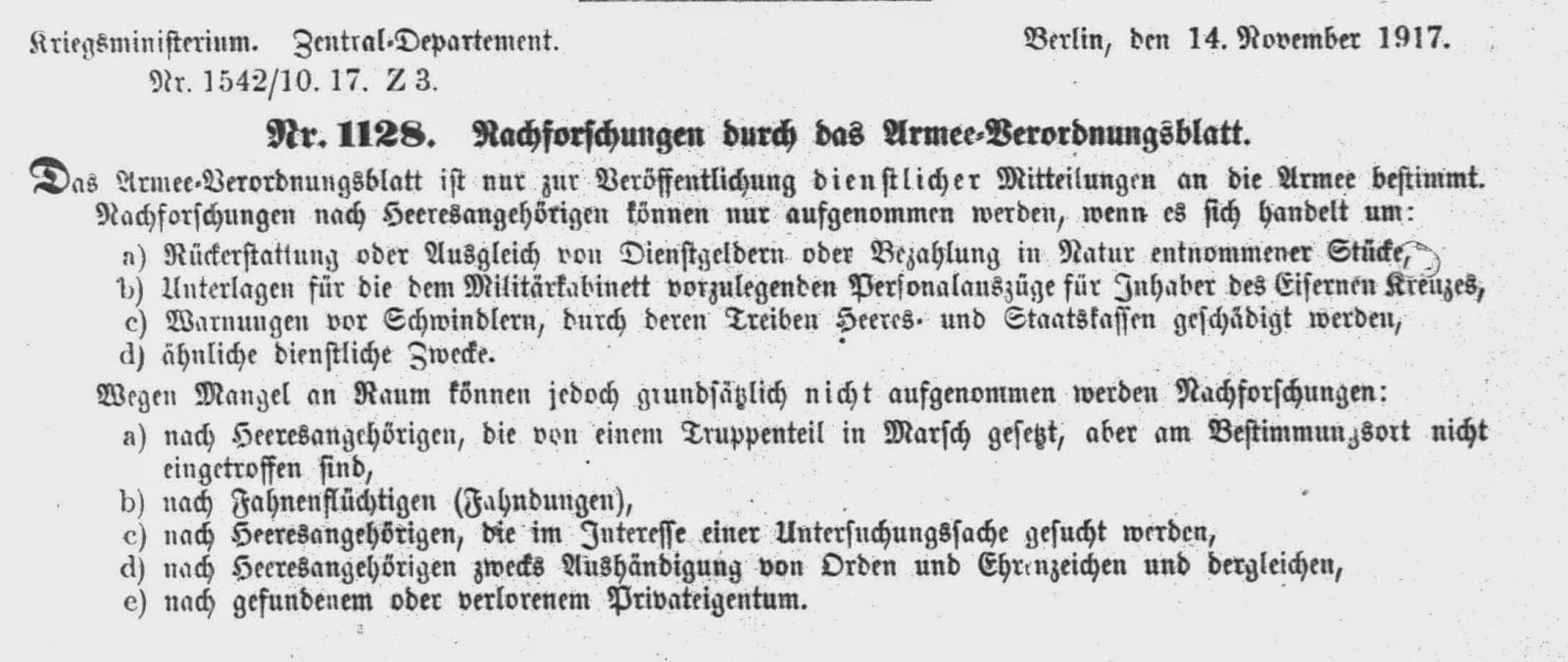 Abweichend von den vorhergehenden Jahrgängen fehlen im Armeeverordnungsblatt des Jahres 1917 die Eintragungen über in Verlust geratene Soldbücher. Im Jahrgang 1917 finden sich aber Suchanzeigen und Warnhinweise zu Armeeangehörigen, die teilweise interessante Details enthalten. Diese Veröffentlichungen werden nachfolgend im Original veröffentlicht.