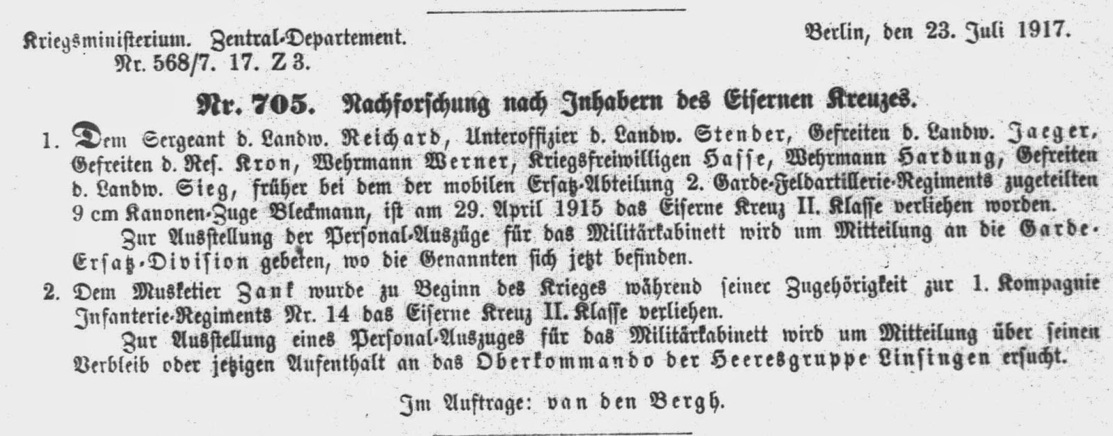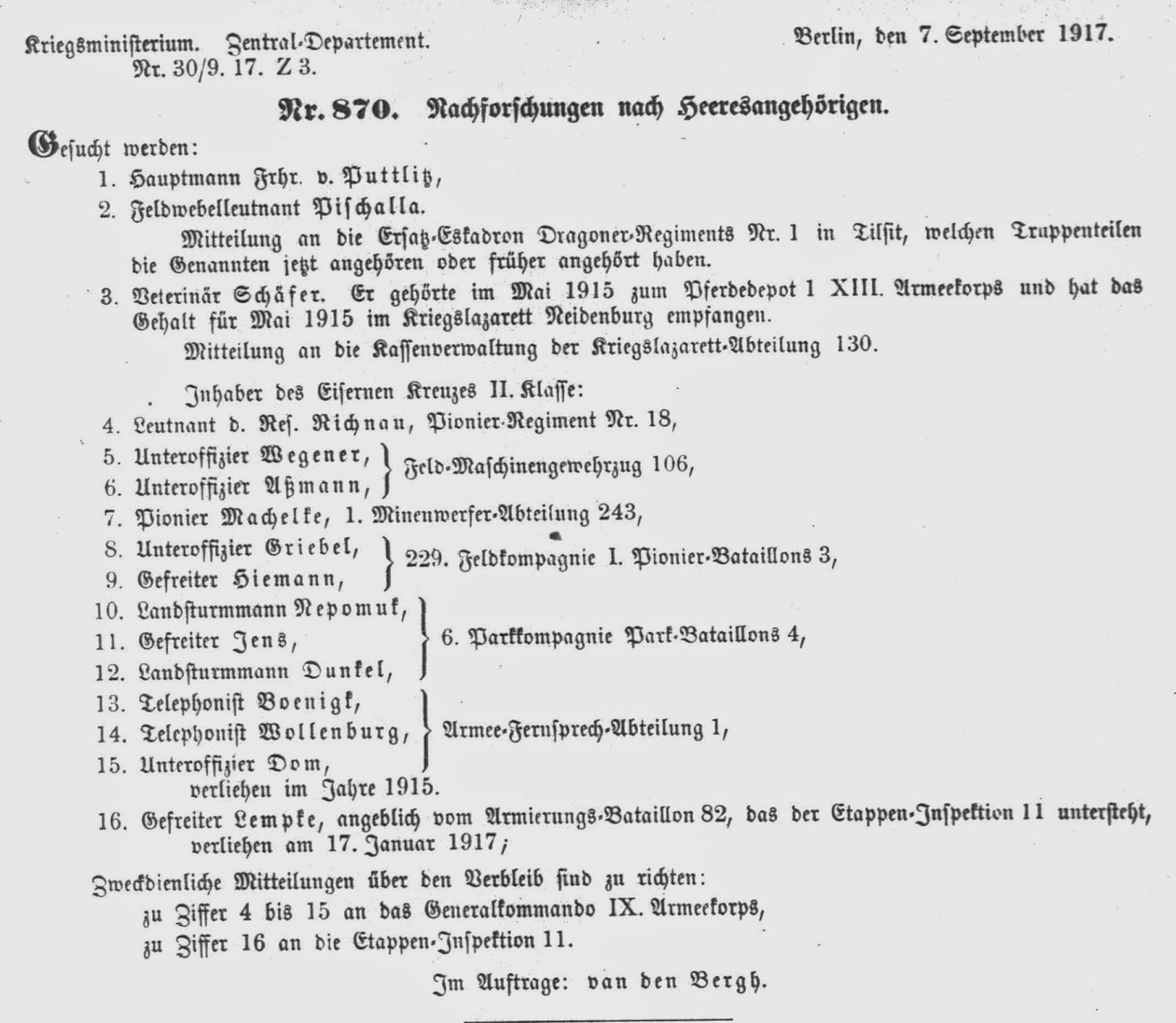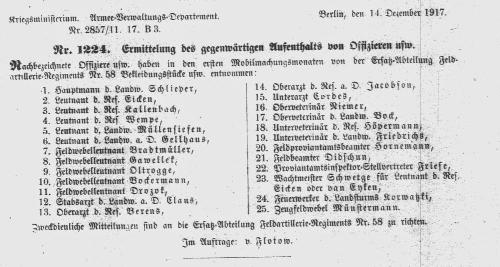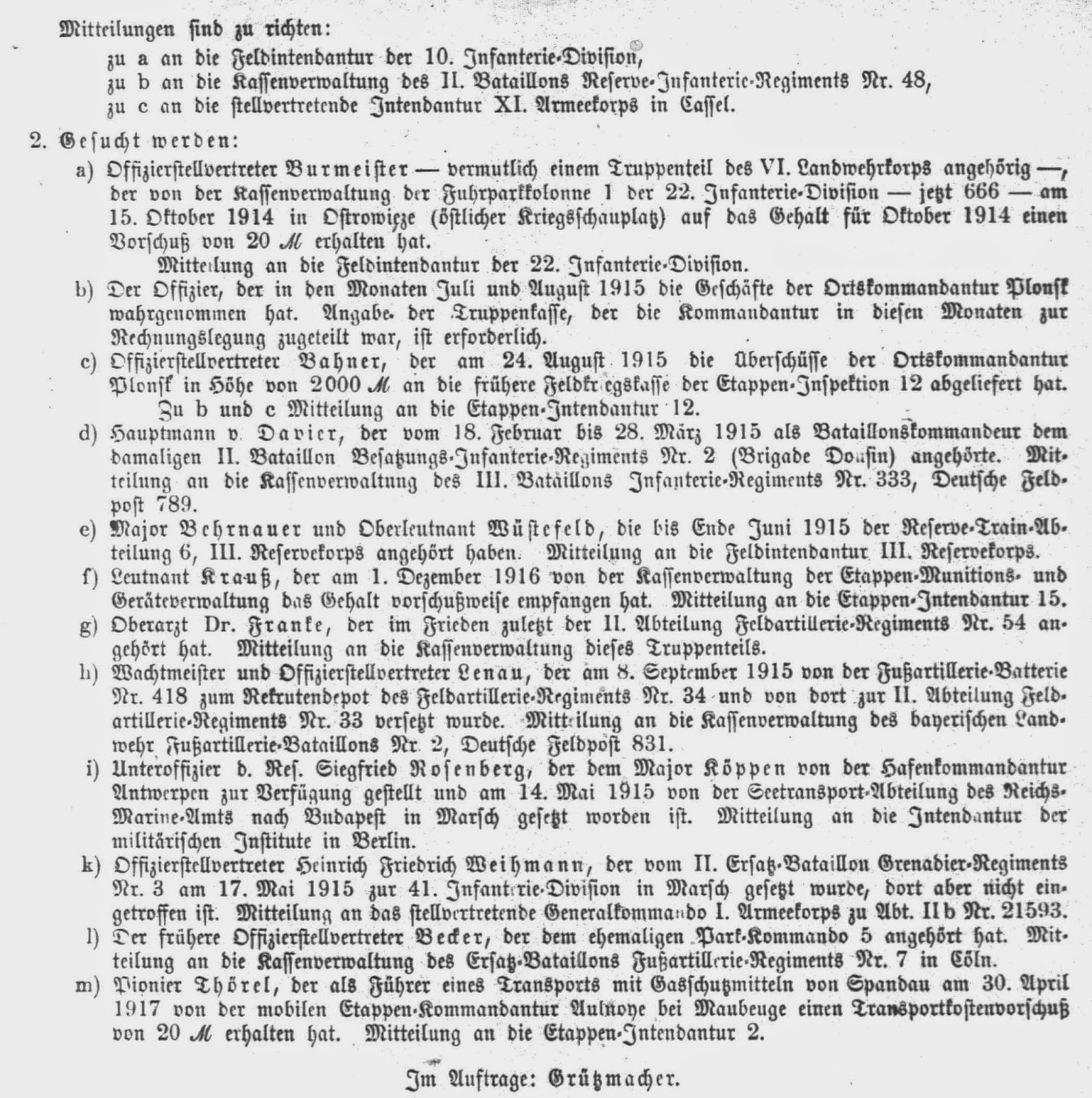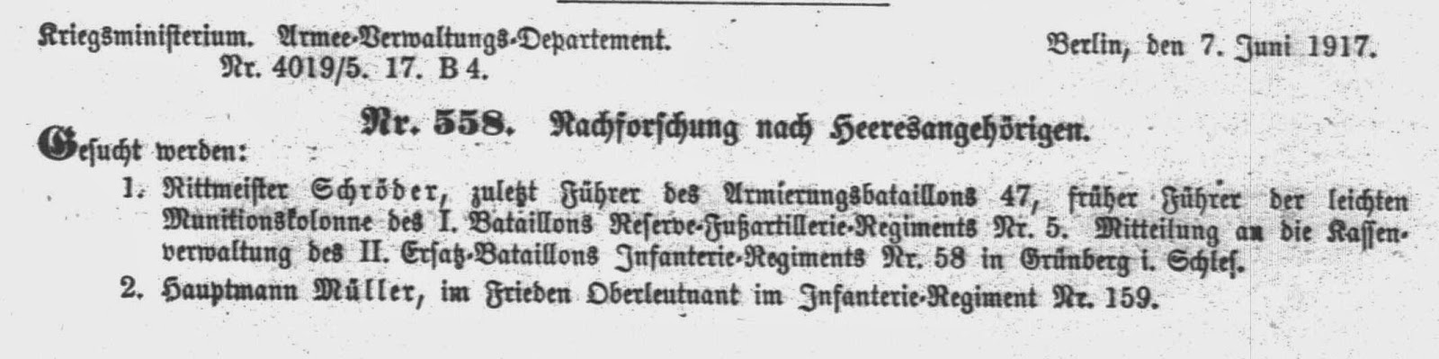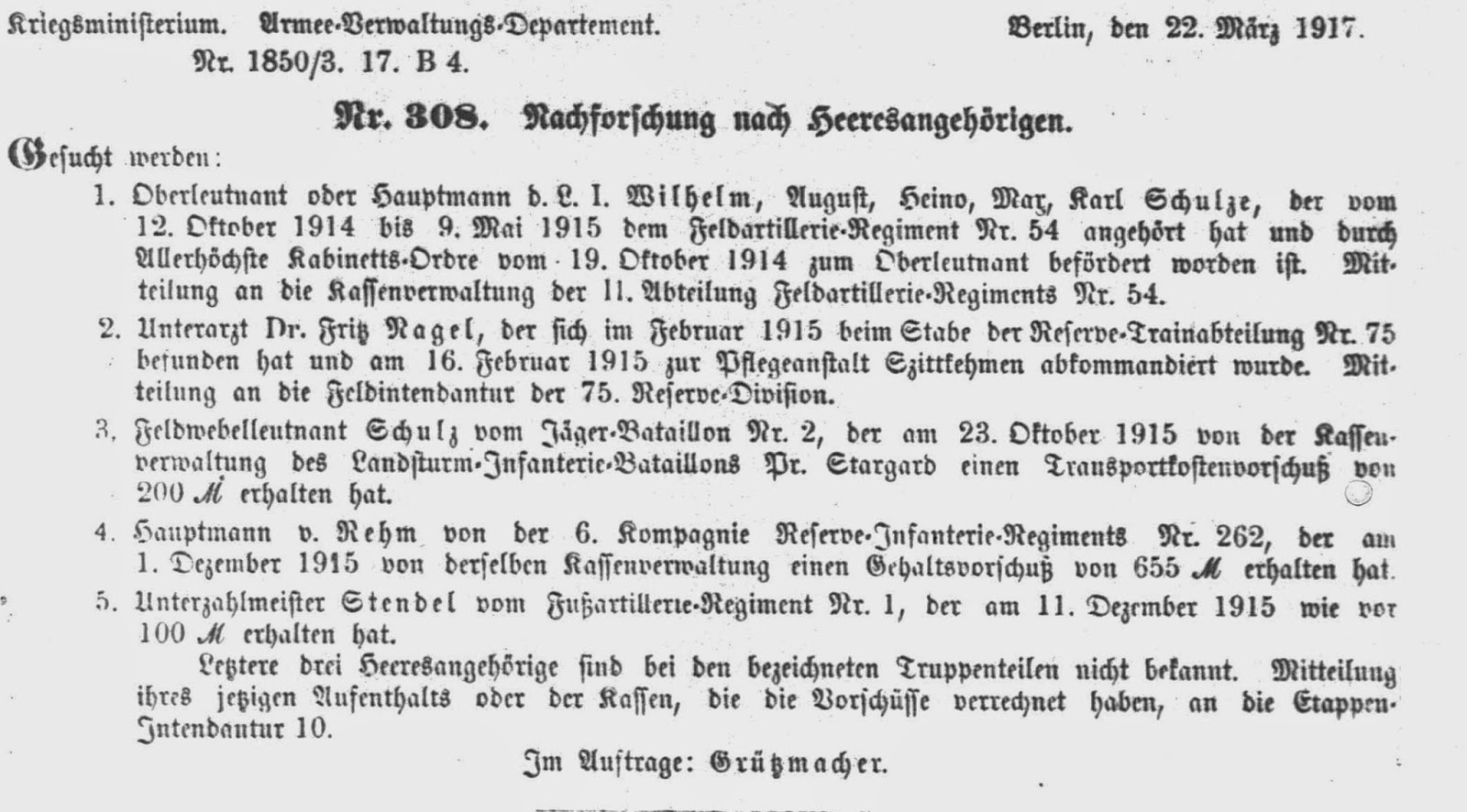 Abweichend von den vorhergehenden Jahrgängen fehlen im Armeeverordnungsblatt des Jahres 1917 die Eintragungen über in Verlust geratene Soldbücher. Im Jahrgang 1917 finden sich aber Suchanzeigen und Warnhinweise zu Armeeangehörigen, die teilweise interessante Details enthalten. Diese Veröffentlichungen werden nachfolgend im Original veröffentlicht.